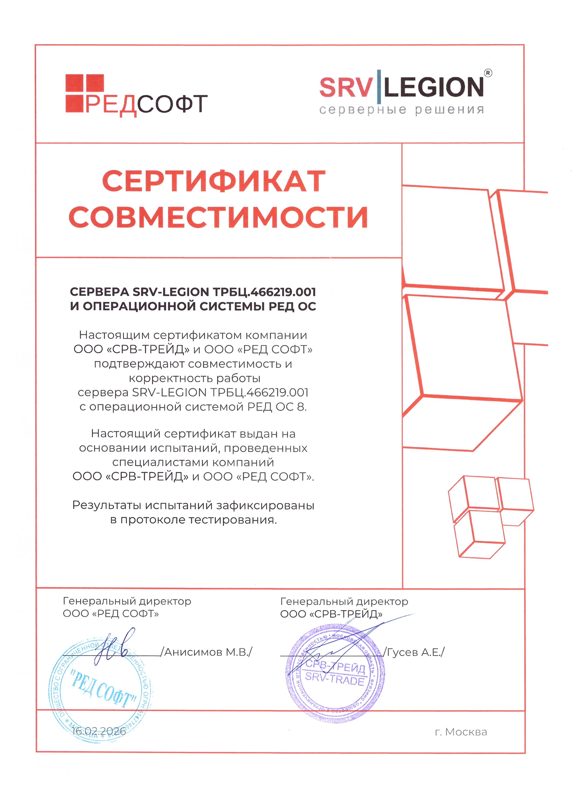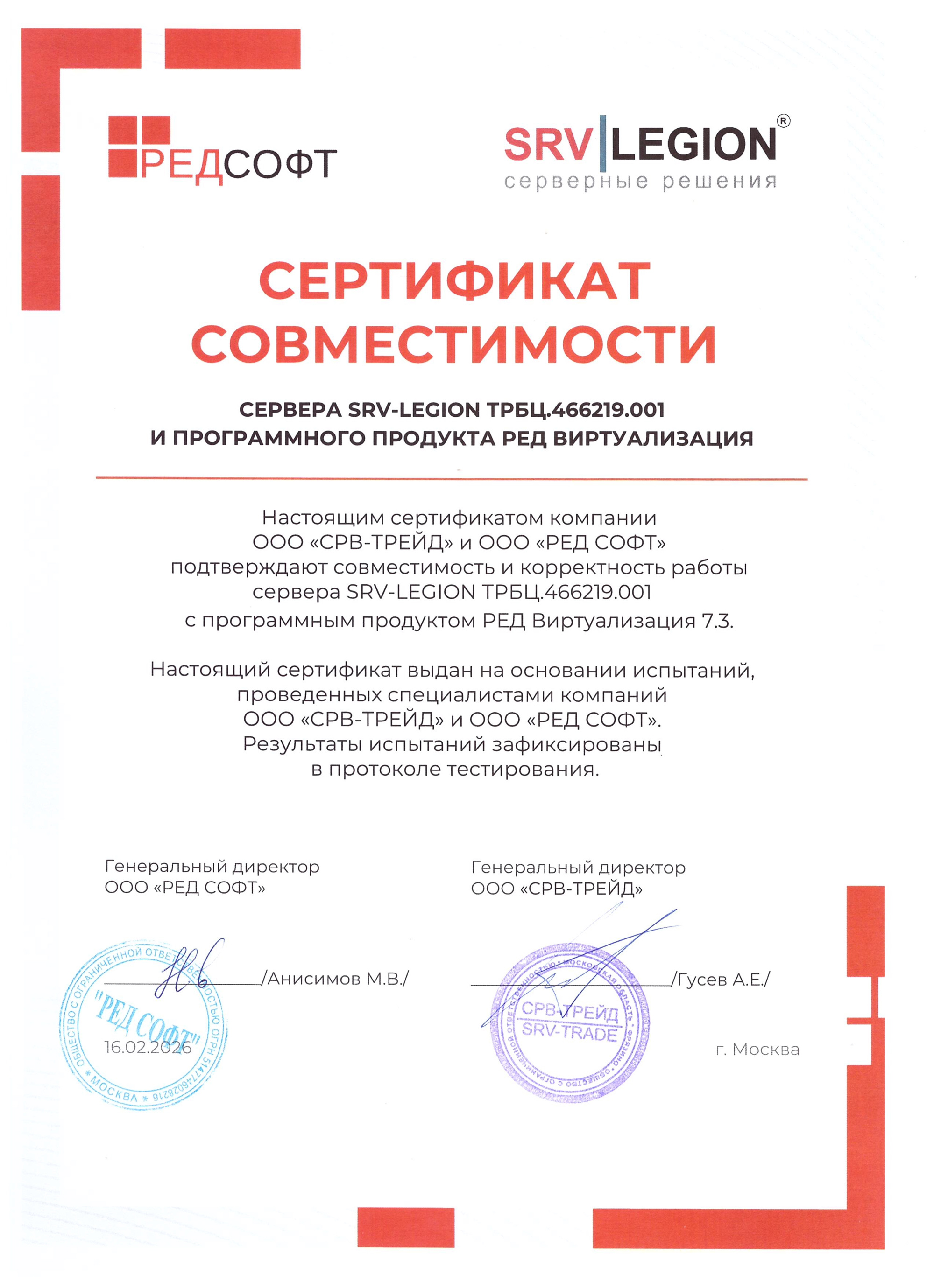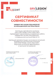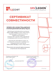 16.02.2026 г получен сертификат совместимости сервера SRV-LEGION ТРБЦ.466219.001 и програмного продукта РЕД Виртуализация.