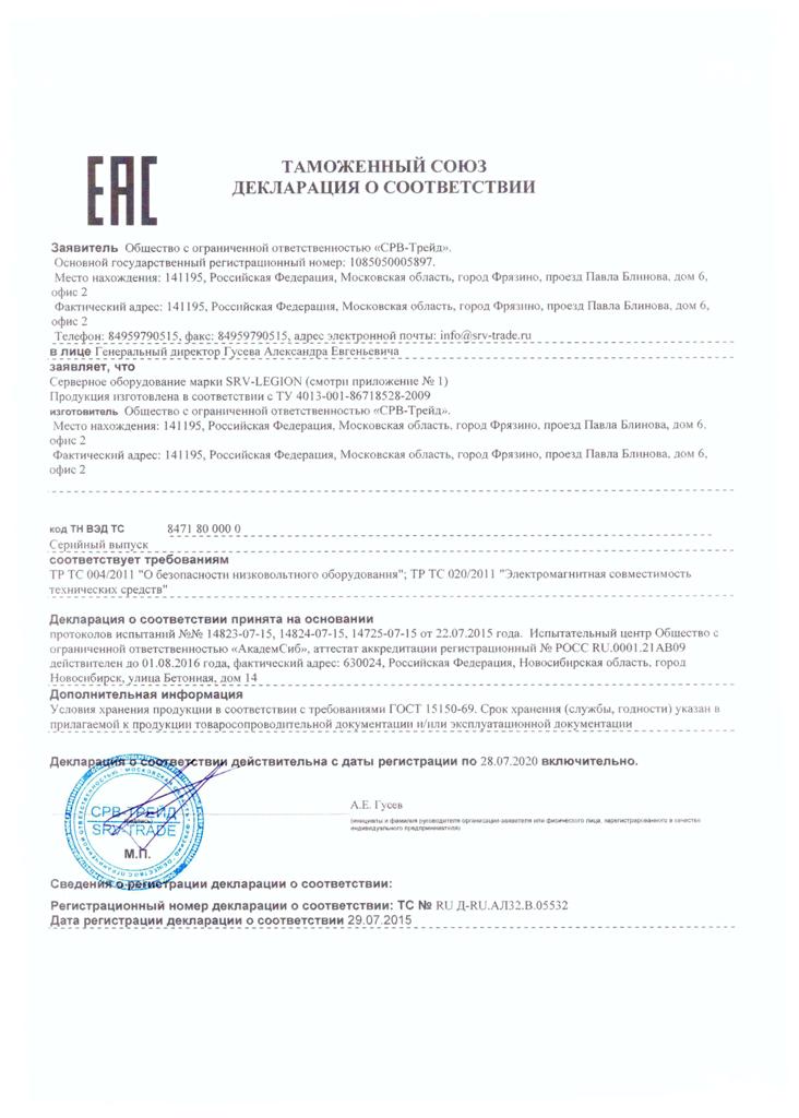 Уважаемые клиенты, на оборудование SRV-LEGION была получена и зарегистрирована Декларация о соответствии техническому регламенту Таможенного союза. Это документ единого образца, удостоверяющий соответствие продукции требованиям безопасности, действующим на территории всех стран-участниц союза. Наша декларация выдана на 1 год и подтверждает безопасность продукции SRV-LEGION, OpenStor, SunStor и JBOD и её соответствие требованиям технического регламента таможенного союза. Серверное оборудование марки SRV-LEGION изготовлено в соответствии с ТУ 4013-001-86718528-2009, а также соответствует требованиям ТР ТС 004/2011 "О безопасности низковольтного оборудования" и ТР ТС 020/2011 "Электромагнитная совместимость технических средств". Декларация принята на основании протоколов испытаний. Испытательный центр: ООО "АкадемСиб", аккредитованный по сертификации продукции и внесенный в «Национальную часть Единого реестра органов по сертификации и испытательных лабораторий (центров) Таможенного союза».